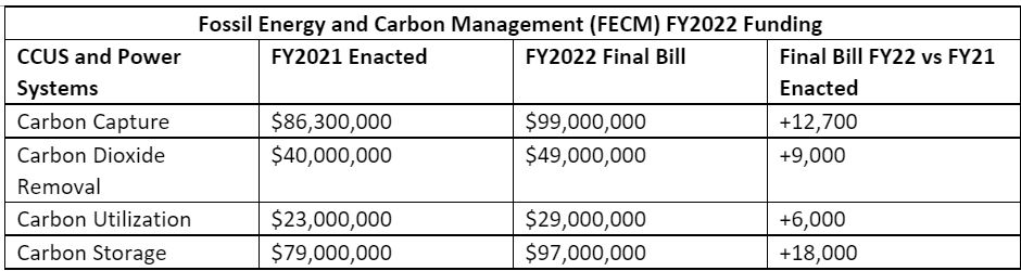 “Building off the unprecedented investments made in the bipartisan infrastructure law, including fully funding the 2020 Energy Act, the FY2022 omnibus includes modest, yet crucial increases for the core carbon management programs at the Department of Energy, with over $45 million in increased funding for carbon capture, removal, utilization and storage technologies. Additionally, the package includes a $2 million increase over FY2021 to expand capacity for the Class VI program at the Environmental Protection Agency – a critical investment to bolster efforts to permit Class VI geologic storage wells and review state primacy applications in a program which has been historically underfunded.