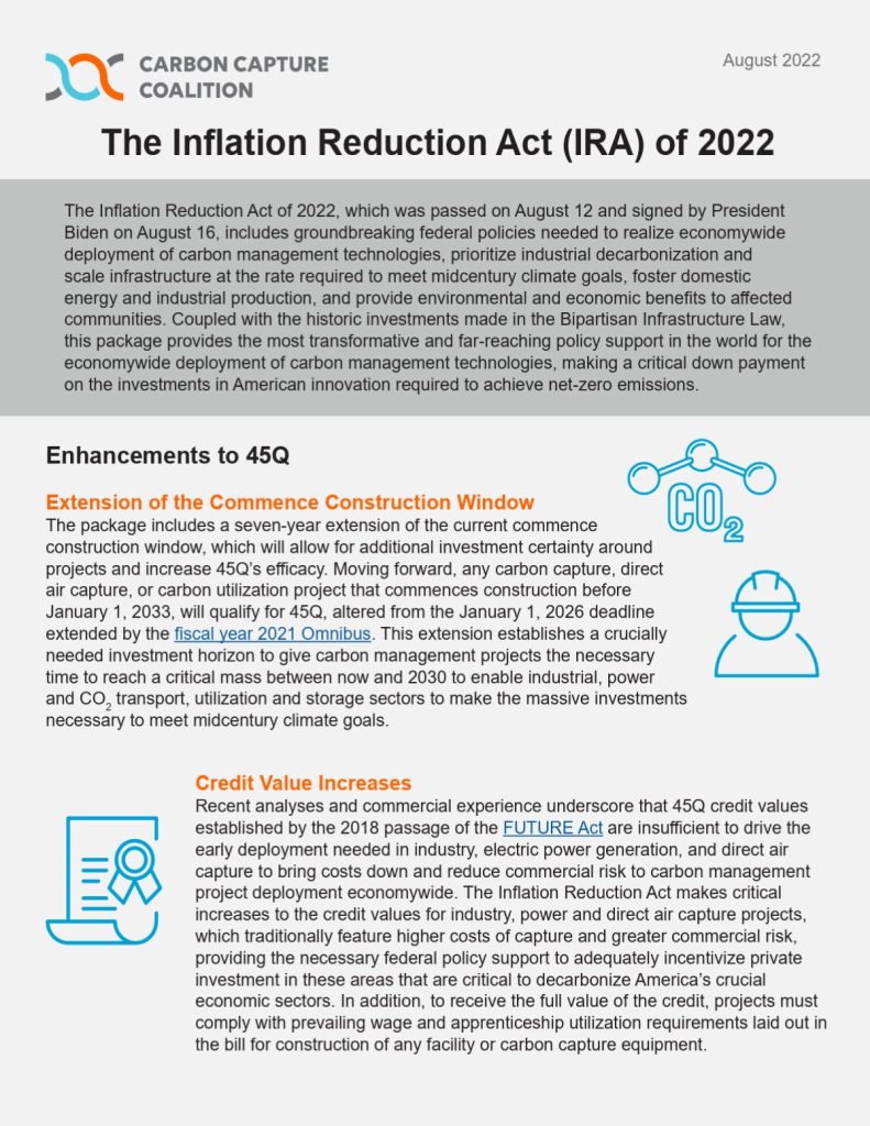The IRA makes major enhancements to the 45Q tax credit, increasing credit values (eg. to $85/ton for industrial/power capture and $180/ton for direct air capture) and extending the construction commencement deadline to January 1, 2033, to give projects more time and certainty. It adds a direct pay option so awardees can receive the full credit value in cash rather than relying on traditional tax equity. The Act also expands transferability of credits, lowering capture thresholds for many project types so more facilities qualify. Explore the full fact sheet to see how these changes could scale US carbon capture and removal to ambitious climate goals.